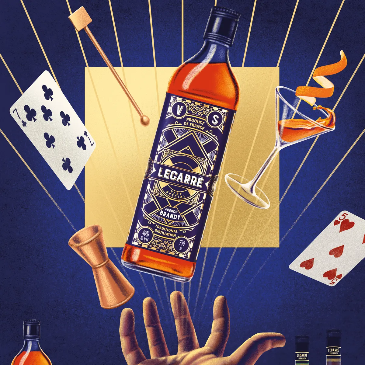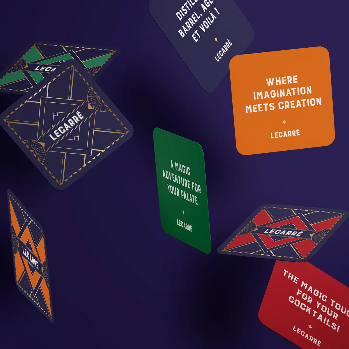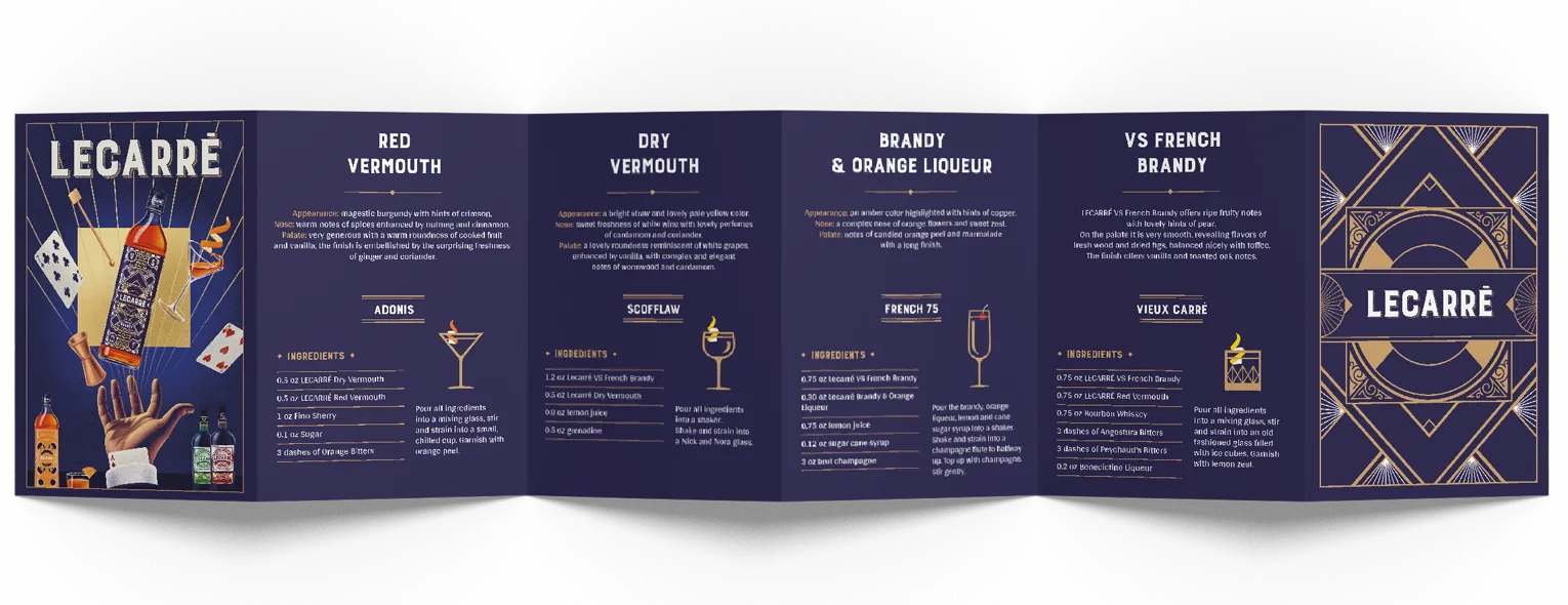 Proposer un nouveau brandy pour le marché américain était l’idée principale. Comment ? Grâce à nom choisi par notre client : Lecarré. Ce nom n’est pas une simple vue géométrique mais une référence historique au quartier Le Vieux Carré de la Nouvelle Orléans, lieu de naissance de la mixologie dans les années 1930. Le décor est posé : à nous de jouer pour créer un packaging à la hauteur !