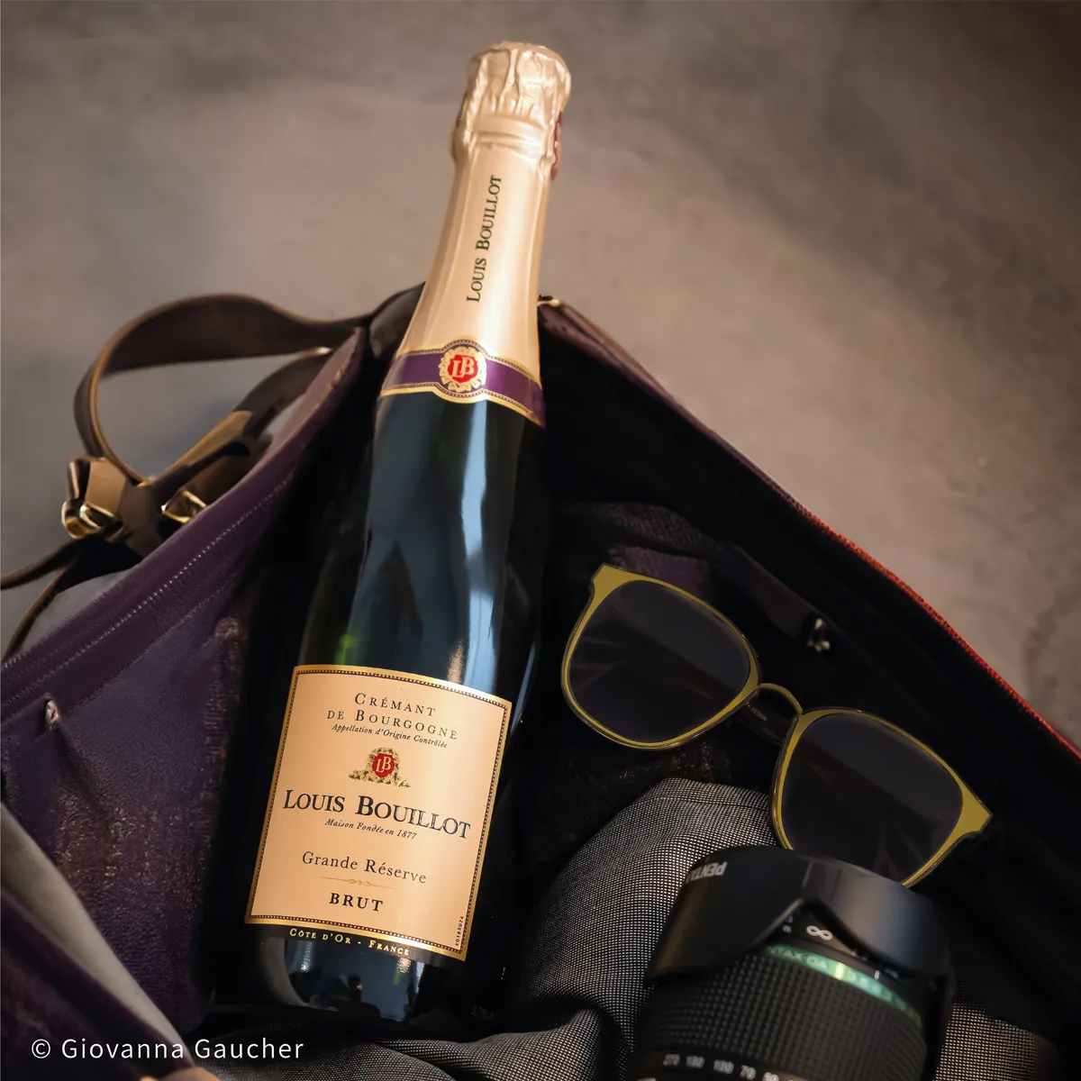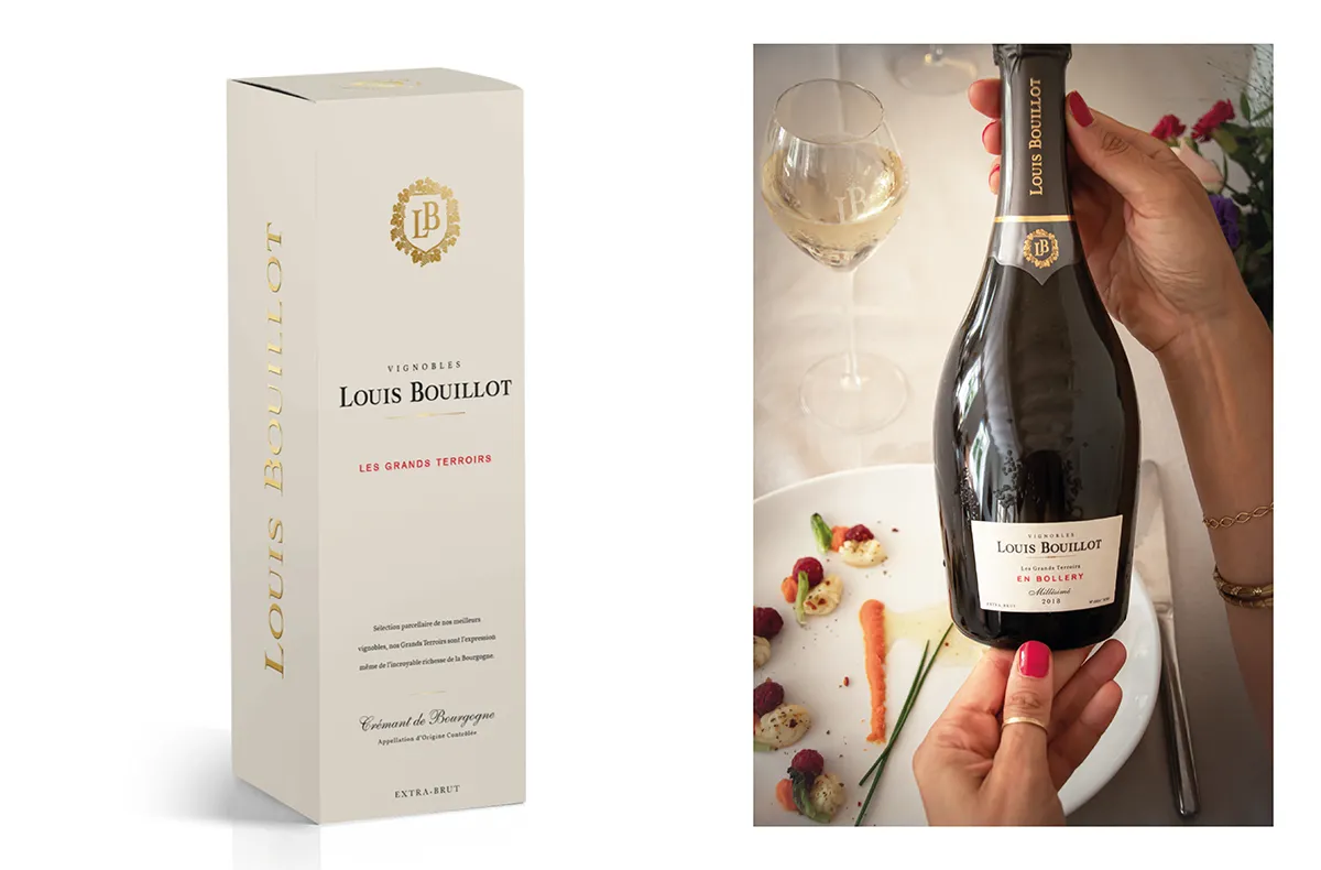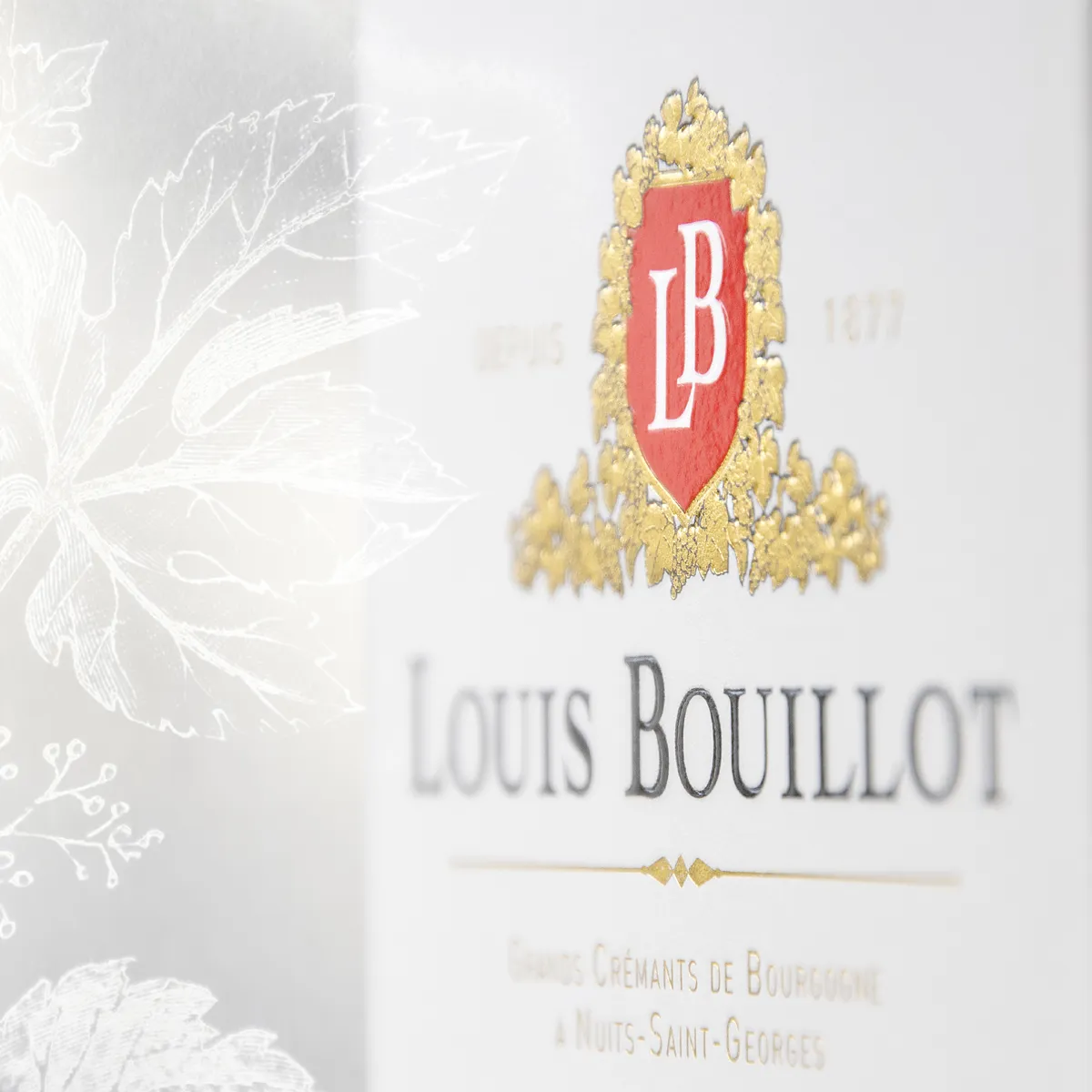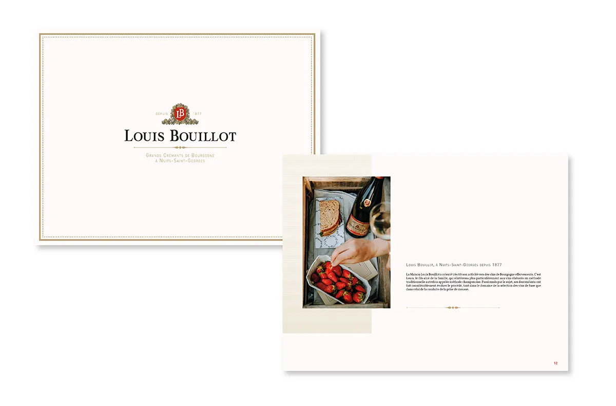 Nous avons regroupé la thématique « histoire » sur le haut de l’identité de marque : le blason et l’année de fondation. Sous Louis Bouillot, grâce à un filet graphique, nous avons pu installé les 2 points forts de la marque : Grands Crémants de Bourgogne et la ville d’ancrage, Nuits-Saint-Georges, réputée en Bourgogne pour ses vins.